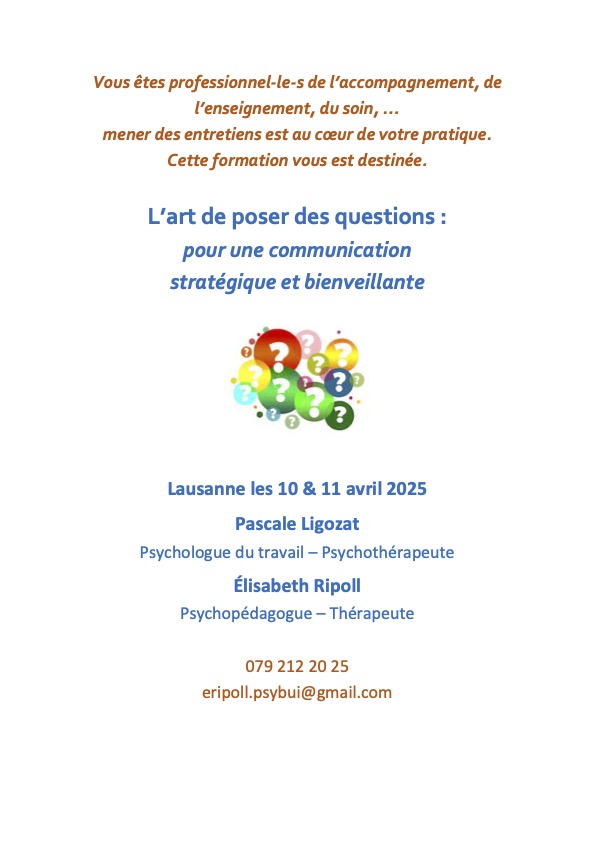 Nous vous proposons 2 journées pour découvrir « l’art de poser des questions » et expérimenter la richesse de ses implications sur la relations et l’accompagnement.